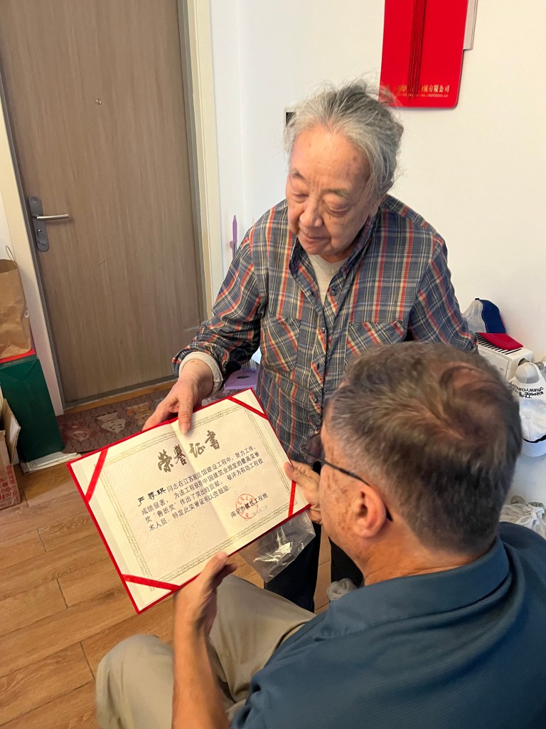 On the way to lunch, we passed by the Nanjing Convention Center, built in the 1990s. Jie’s mom was the chief engineer when it was built—the first woman in China to hold such a position. She received a First Place National Honor for her accomplishment. When we told her we had been by “her” building, she got out the award and showed it to us.