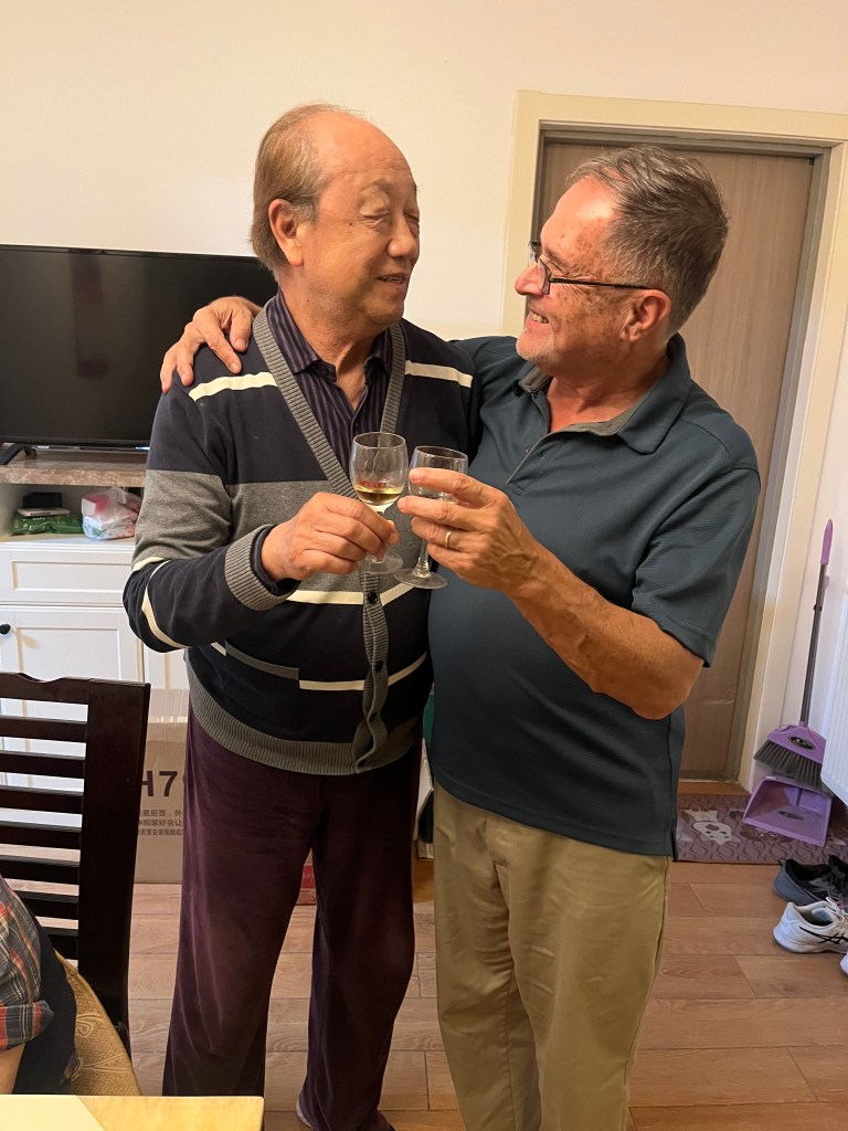 It is customary to bring gifts to one’s family when traveling to China. I got my mother-in-law a nice dishtowel with a map of Illinois–so she could see where all the family lived. For Jie’s dad, I got him a Cub hat as a gift—telling him the Cubs were one hat-wearing fan away from winning it all next year. And I brought him a U of I shot glass for his whiskey. And I brought him a large mug—for when he had a hard day and needed more than a shot. Even though I’m not a whiskey drinker, as I was getting ready to leave, I asked him if he and I could have a toast. It was a chance for me to express my love and appreciation for them both. In turn, they responded with their own words of affection and gratitude. Then we two men clicked our glasses—and I headed off to my hotel.