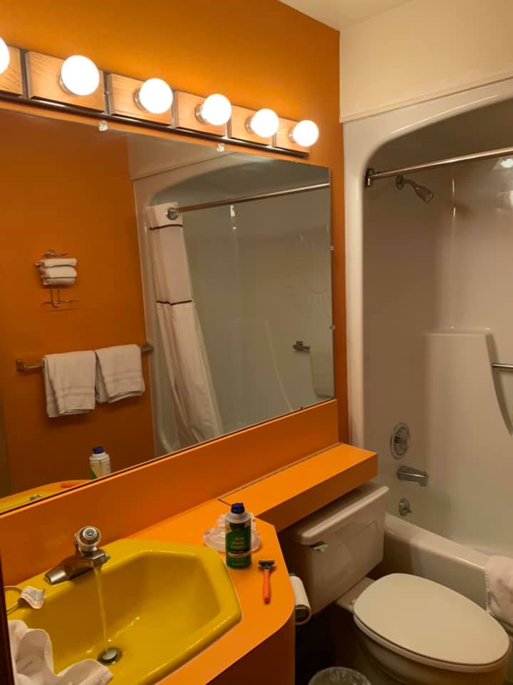 August 7: In Helena, Montana tonight, my first time here. Saw the state capitol building (grand) and the state history museum (they need some pointers from the North Dakota folks.). Climbed Mt. Helena. More or less. I huffed and shuffled my way up the first 700 feet of elevation. (about 3/4 of a mile) and met two teenagers coming down. They told me that the final route was not too long but real steep and rocky. They pumped me up and told me I could do it! Then they hiked back down and left me on my own. I trudged on. And when they were out of sight (homage to my pride) I checked my smart phone and saw that I had just climbed the equivalent of 65 stories. And I thought about the loose rocks, the promise of a steeper path… and assured they would never see me, headed back down (homage to my wisdom.) stayed last night in the “Dude Rancher Lodge” in Billings. A little leary because of the name. See photo below of the bathroom: bright orange walls and mustard colored sink. Different. Other photo is looking down on Helena from my hike today. 250 miles driven.