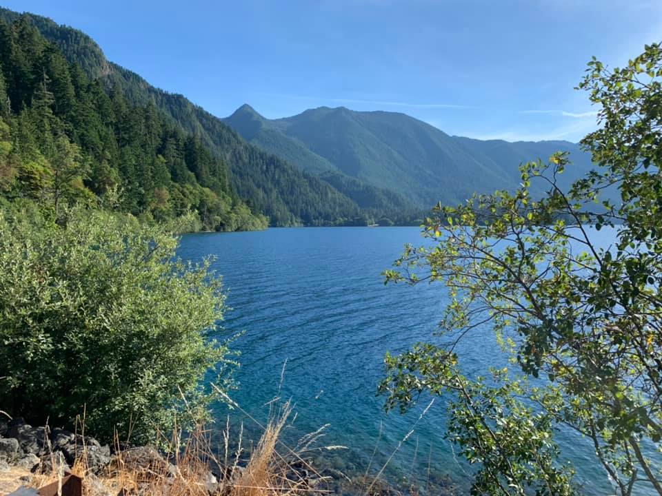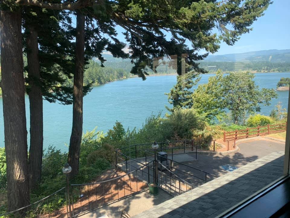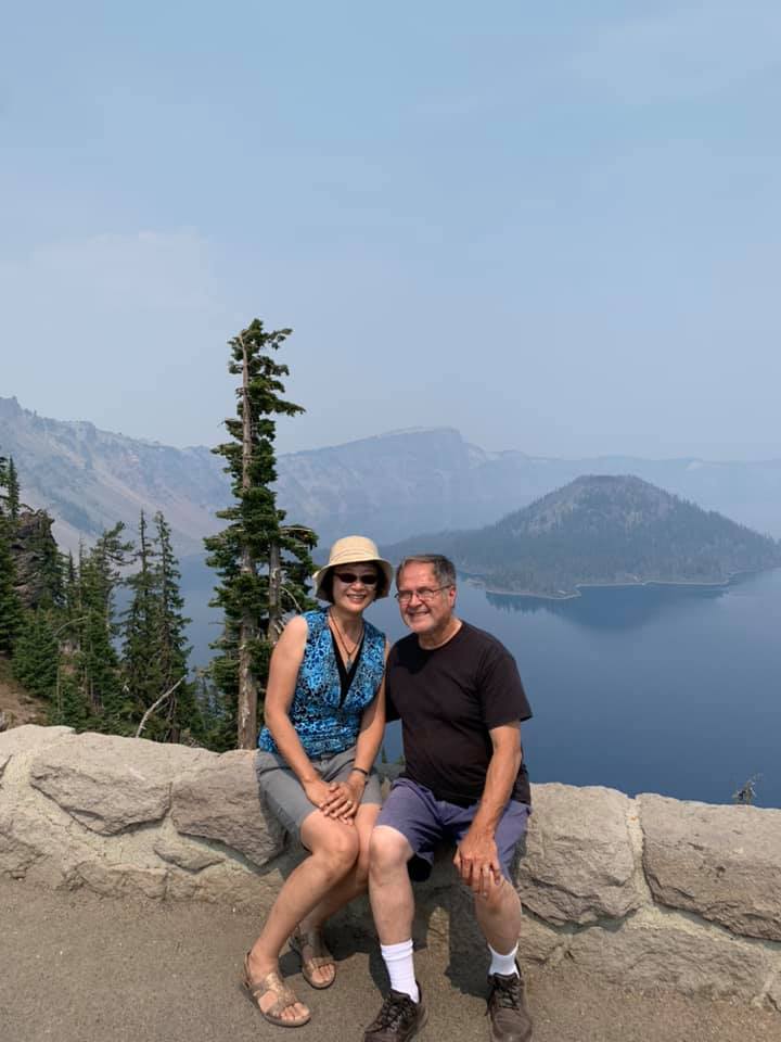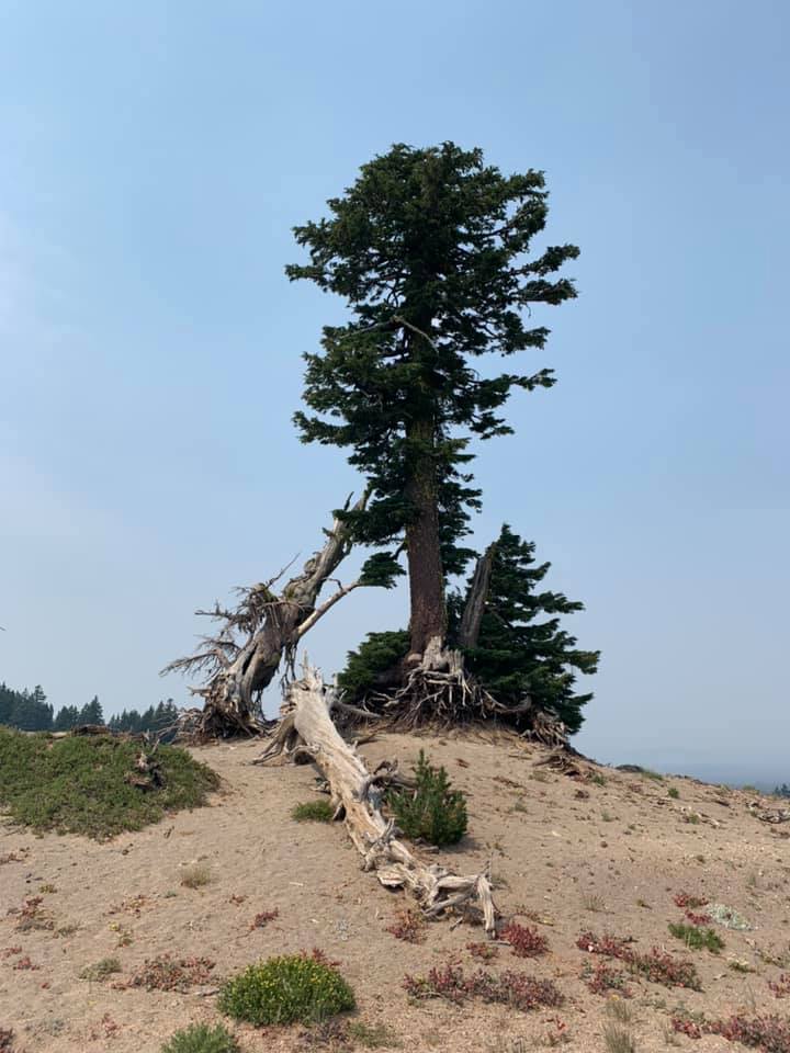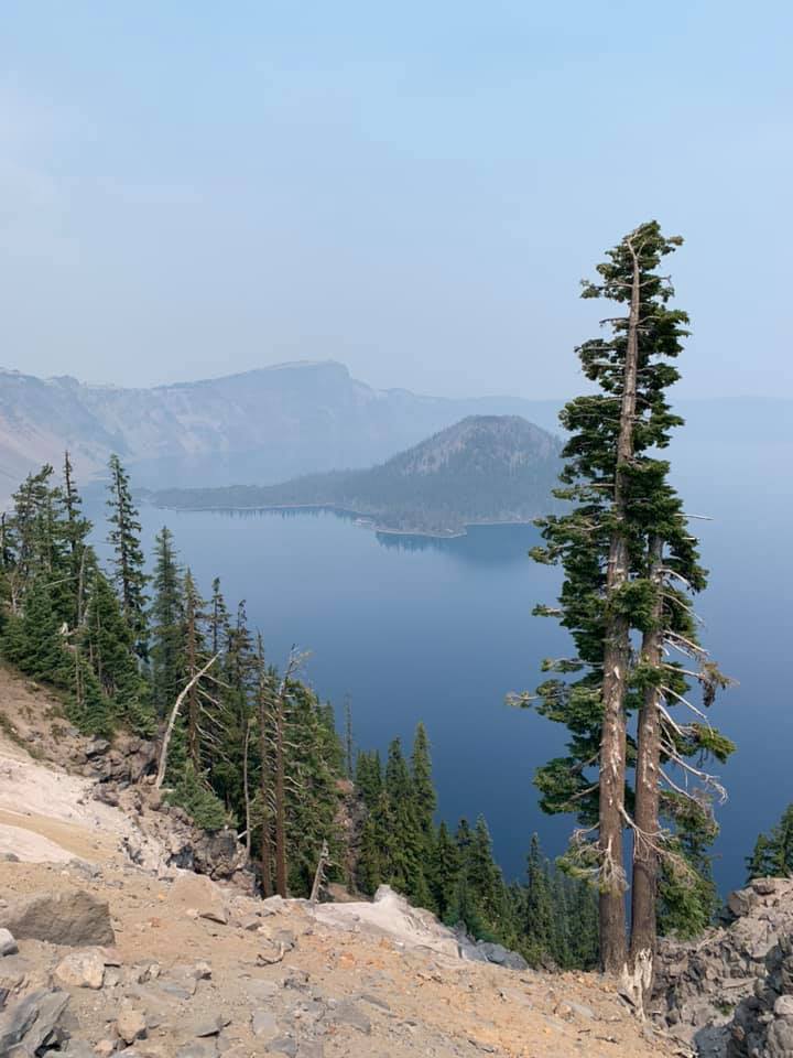 August 14: Today’s trip was to Crater Lake National Park. We also experienced our first sense of the wildfires: the smoke and the odor. While not near any fires ourselves, the smoke travels hundreds of miles and lingers in mountain forests. We drove through more than two hours of it today. The smoke also left a thick haze over Crater Lake and the normally deep blue lake was a dark gray today. But everything is beautiful in its own way. And it was very much a day of taking in wonder and beauty. Back tonight in our delightfully funky hostel in Eugene. Pictures today are of the haze (from wildfires) on the way there, Crater Lake, some scenery around the National Park, and the breakfast patio at our hostel.