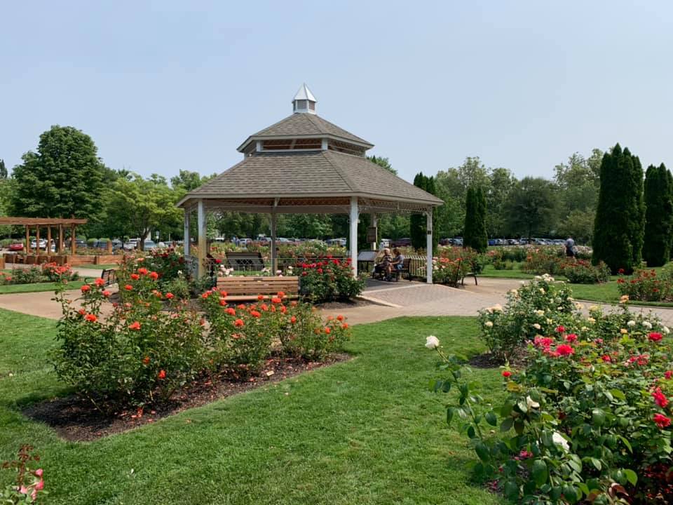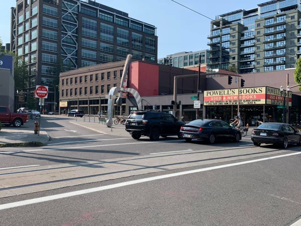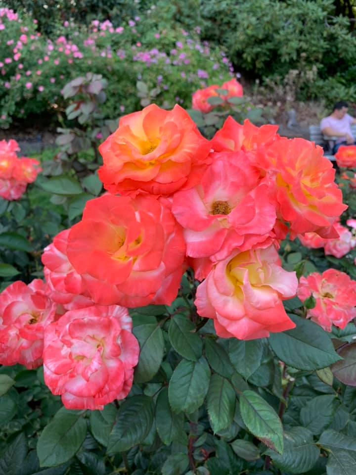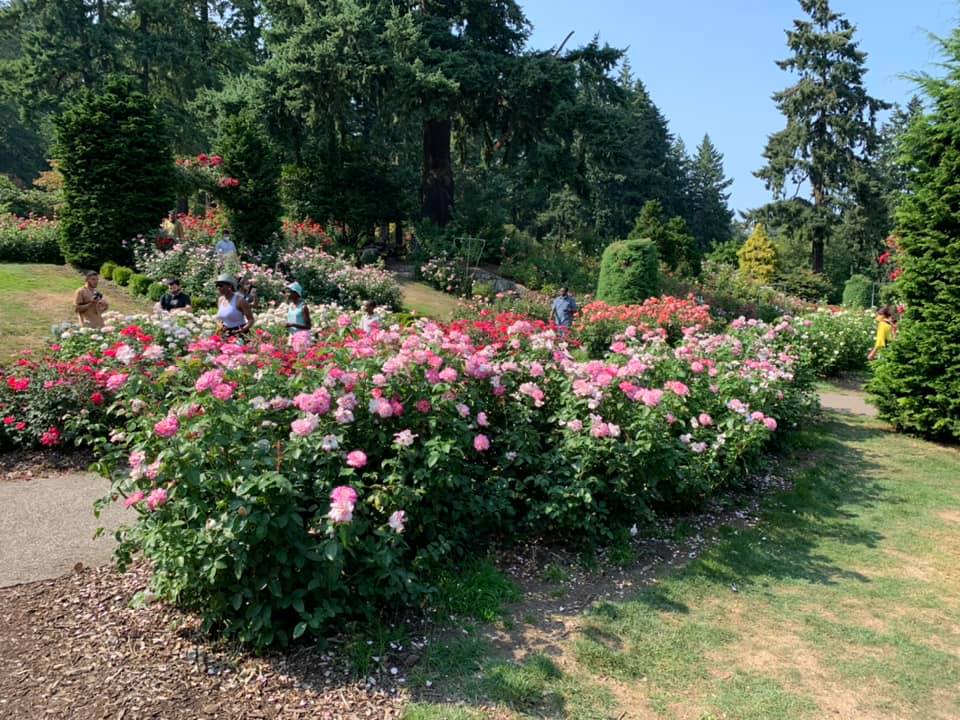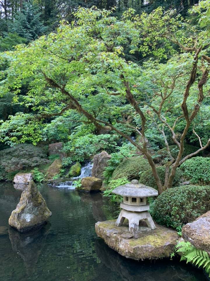 August 15: Portland, Oregon greeted us today with the side Of the downtown building decorated with the delightful phrase, “Keep Portland Weird.” We had lunch with a middle school friend of Jie’s Who has lived here for 25 years. She had a lot of interesting context to share about Portland’s more recent history with politics and protests. It was hot here, 95°, but not unbearable. We visited the Japanese gardens, the international Rose garden, and Powell’s bookstore. The rose garden was started at the beginning of World War I to try and preserve roses from around the world so that they wouldn’t be destroyed as armies were ruining each other’s country sides in that war. The garden has continued, expanded, and sponsored research into rose growing. Powell’s bookstore it’s probably the best independent bookstore in the country, taking up a whole city block. Jie is out to supper with her friend tonight, and I am downtown experimenting with a Mexican restaurant. Photos today are from the Japanese garden and the Rose garden. There is also a photo of Powell‘s bookstore. Finally, there was a photo of my supper, to prove that I am eating healthy. Enchiladas Verde.