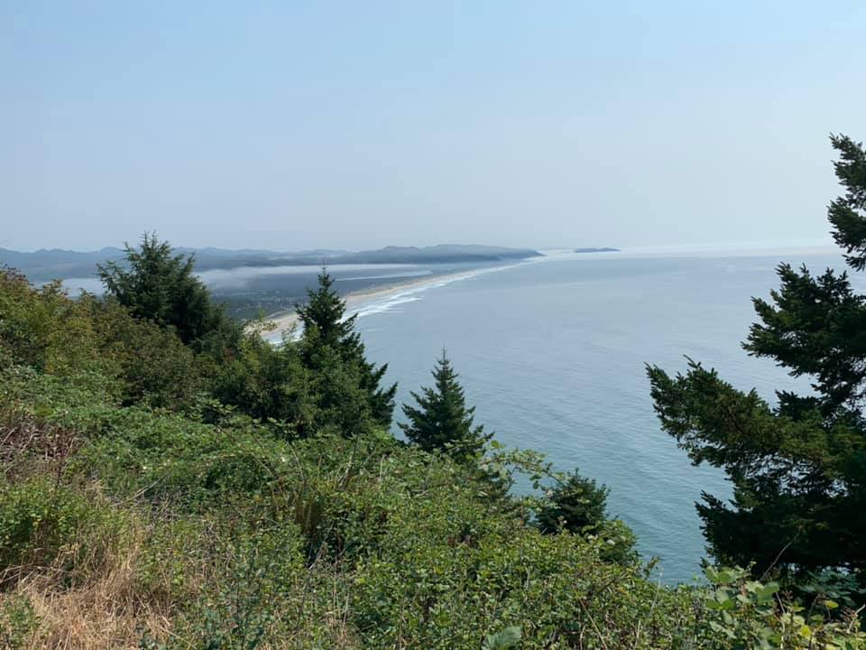 August 13: This was a day of rivers, oceans, and the funky town of Eugene, Oregon. Staying tonight in the International Hostel in Eugene…like visiting your hippie aunt in a commune. Not your normal Motel 6. This morning we picked a quart of blackberries which we discovered when we pulled off on a countryside road to change drivers. Got stuck in traffic on the 101 coastal highway in Oregon because it was 65 degrees there and everyone in Portland and Salem was trying to escape temperatures approaching triple digits. Ate ice cream at the creamery in Tillamook (on the 101), heart of dairy country. Walked the beach and ate more clam chowder in the seaside village of Cannon Beach. One photo is of the smoking porch at the hostel. One is of blackberries. A couple pictures include rock formations and swimmers at Cannon Beach. And one is from the coastal highway overlook. If the hippies leave me alone tonight we’ll head for Crater Lake tomorrow and return here for a second night afterwards. Getting strange smells wafting up into my bedroom so will sign off for the night. Sweet dreams everyone.